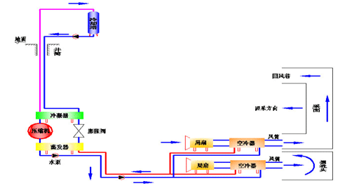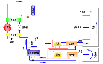 礦井降溫簡介: 地?zé)釣?zāi)害是隨著煤礦開采深度的不斷延深而出現(xiàn)的又一大災(zāi)害。它不同與瓦斯、水、火、頂板、沖擊地壓等災(zāi)害是瞬時爆發(fā)形成災(zāi)害。而是一年四季持續(xù)不斷的區(qū)域性災(zāi)害,對生產(chǎn)影響時間長、范圍廣、涉及人員多,是嚴(yán)重威脅煤礦安全高效生產(chǎn)的主要災(zāi)害之一。在高溫礦井中,當(dāng)采用加大風(fēng)量等非人工制冷降溫措施后還不能把礦內(nèi)氣溫值降低到規(guī)定的標(biāo)準(zhǔn)時,就必須采取人工制冷降溫措施,即采用礦用空調(diào)設(shè)備對礦內(nèi)空氣進(jìn)行人工冷卻。
